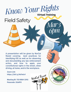 A presentation will be given by NorCal Resist covering best practices for identifying ICE as well as for observing and documenting any law enforcement action, and how to apply your constitutional rights in the street, when driving, at home, and in the workplace.